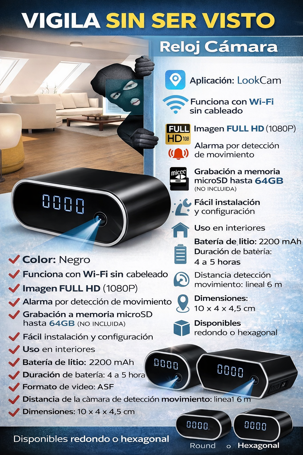 A simple vista es solo un reloj. Por dentro, es tu aliado para ver lo que pasa sin levantar sospechas. Protege tu espacio sin cámaras visibles.